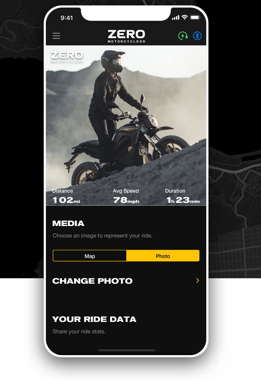 The "Next Gen" app connects to the motorcycle’s dashboard and Cypher III firmware, creating a feature-rich ecosystem, allowing riders to control the bikes performance with customized Ride Modes and dashboard. Utilizing cellular connectivity, riders have the ability to monitor the bike in four main areas: Bike Status, Battery Charging, Ride Data, and Updates / Upgrades.