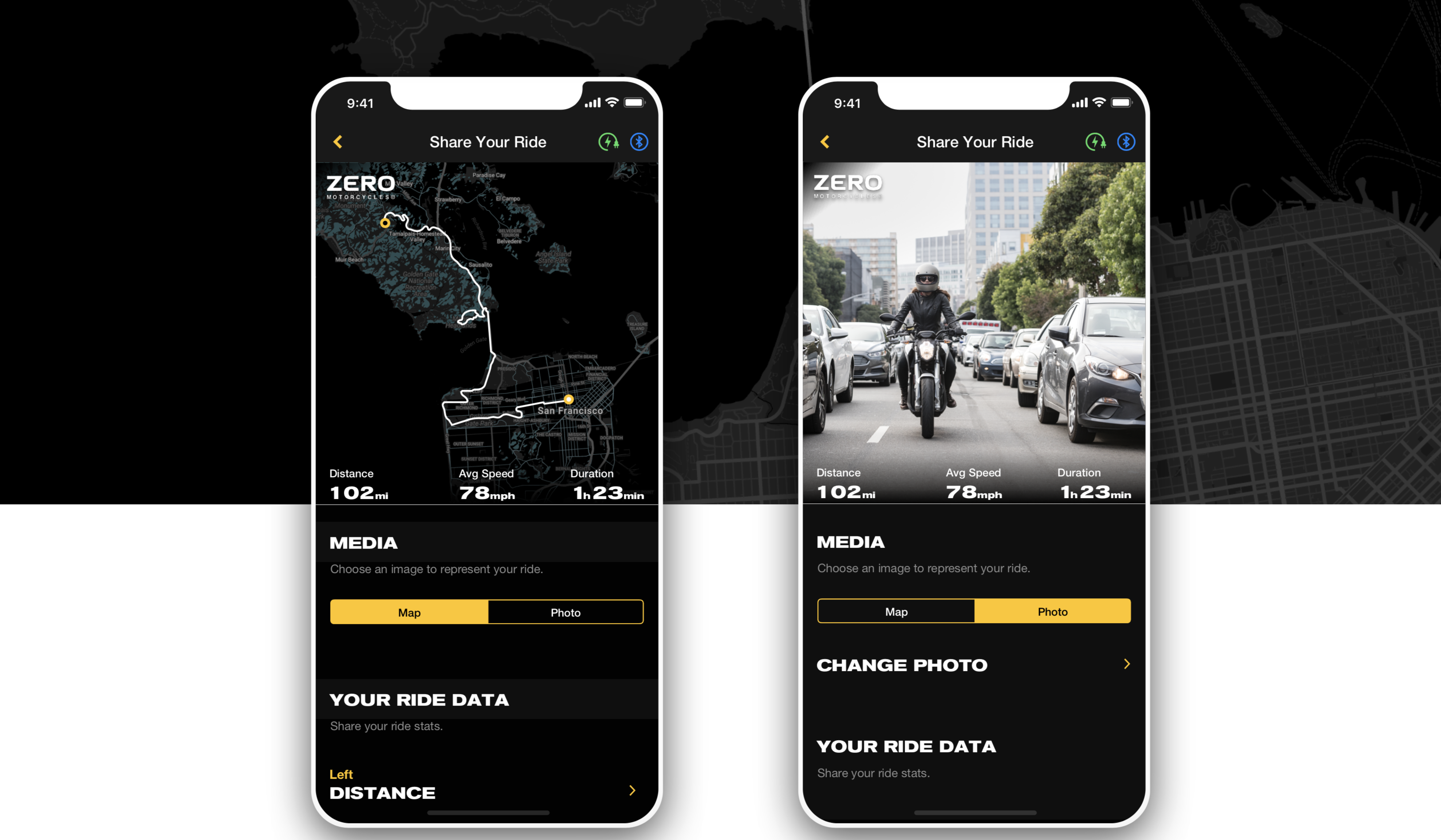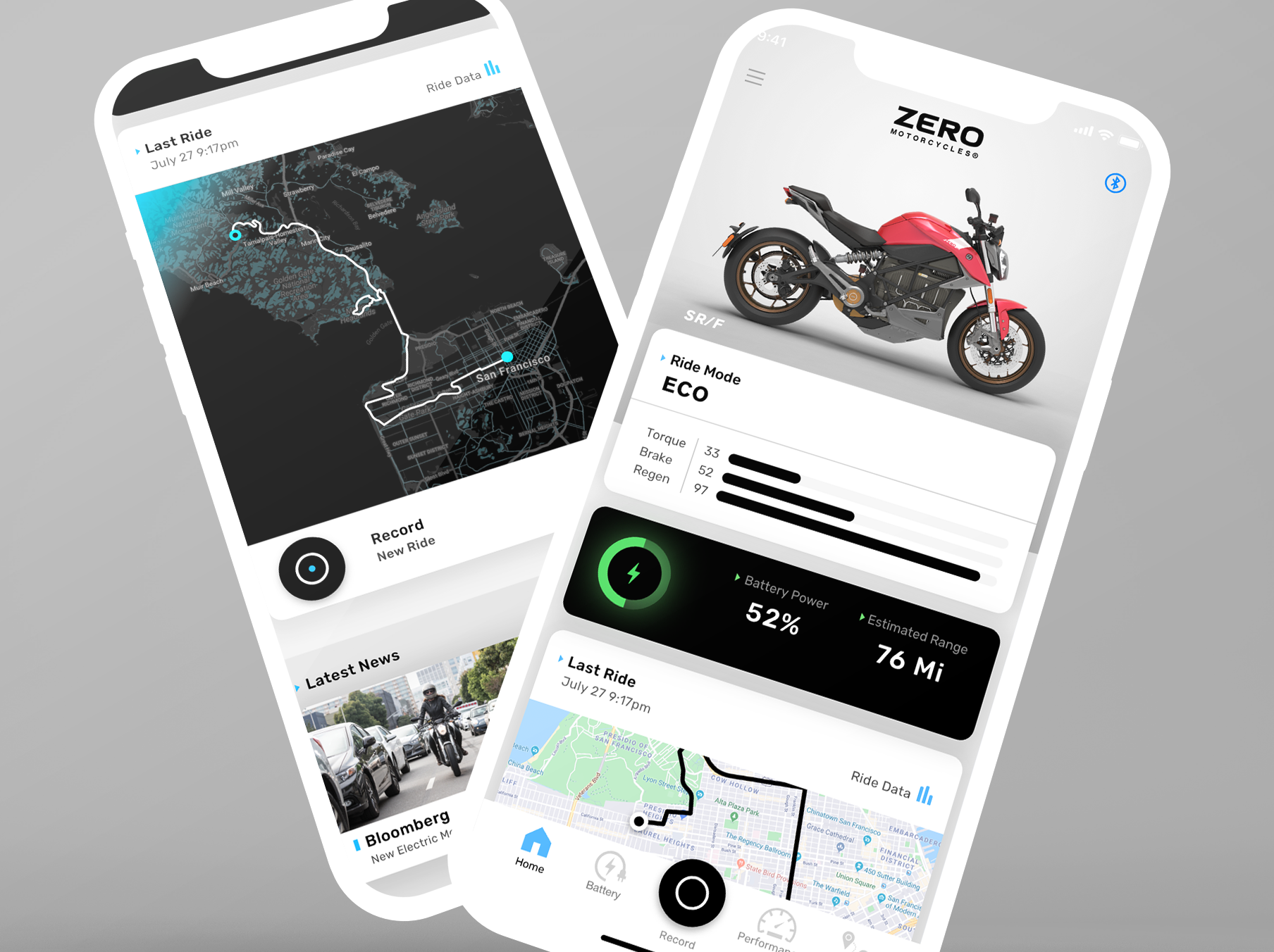 I was the Design Lead for the development of Zero Motorcycle's "Next Gen" app for it's full lineup of all-electric motorcycles. The app connects to the bikes dashboard and firmware to control performance, battery power, and record, replay, and share ride data, creating the industries first "Smart" Motorcycle.