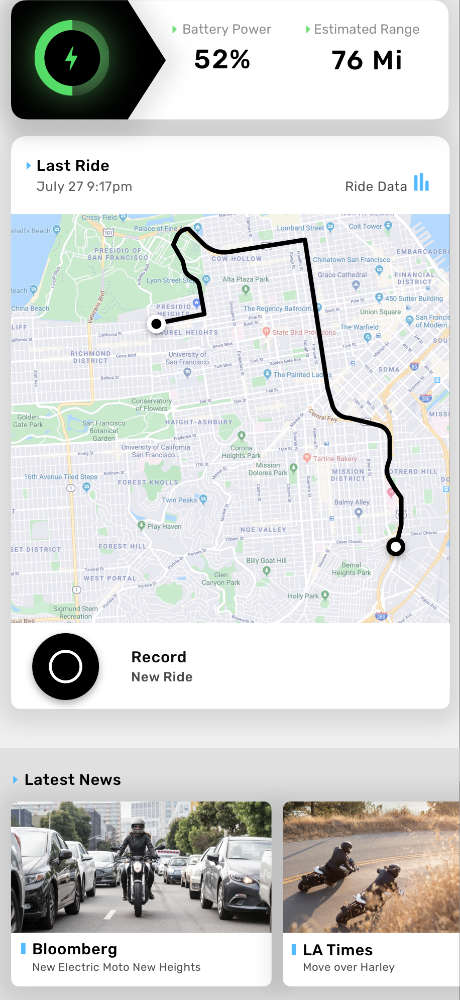 The "Next Gen" app connects to the motorcycle’s dashboard and Cypher III firmware, creating a feature-rich ecosystem, allowing riders to control the bikes performance with customized Ride Modes and dashboard. Utilizing cellular connectivity, riders have the ability to monitor the bike in four main areas: Bike Status, Battery Charging, Ride Data, and Updates / Upgrades.